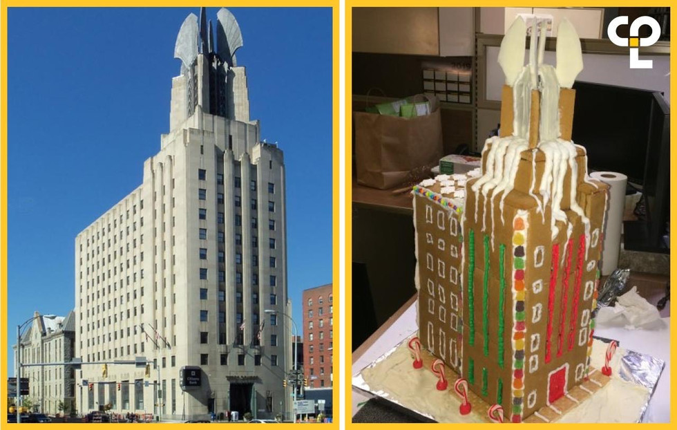 Eight teams constructed incredibly detailed “gingerbr+EDIFICES” based on local Rochester landmarks. Buildings made of edible goods included the Charlotte-Genesee Lighthouse, the Susan B. Anthony House, Andrews Terrace, Lamberton Conservatory, St. Joseph's Park, East Avenue Wegmans, and the Times Square Building. In line with the Centennial theme regarding ‘shelter’ that recurred throughout the year, these edible models were then auctioned to benefit a local homeless shelter. Bergmann's team, Eight Days of Baking, received a gift basket for their highest grossing Temple Sinai, which brought in $125.